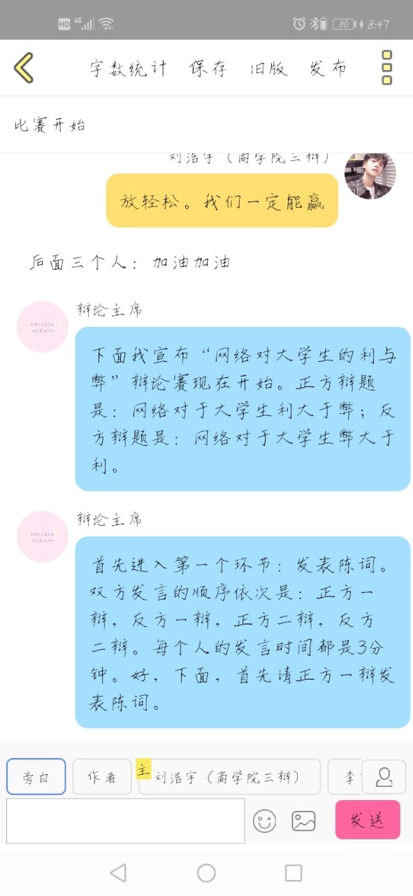 刘浩宇(商学院三辩)这是我和李艺欣两个人的决定,一会庆功宴我再具体给你们说,我们先回去换衣服了,一会时间地点发群里