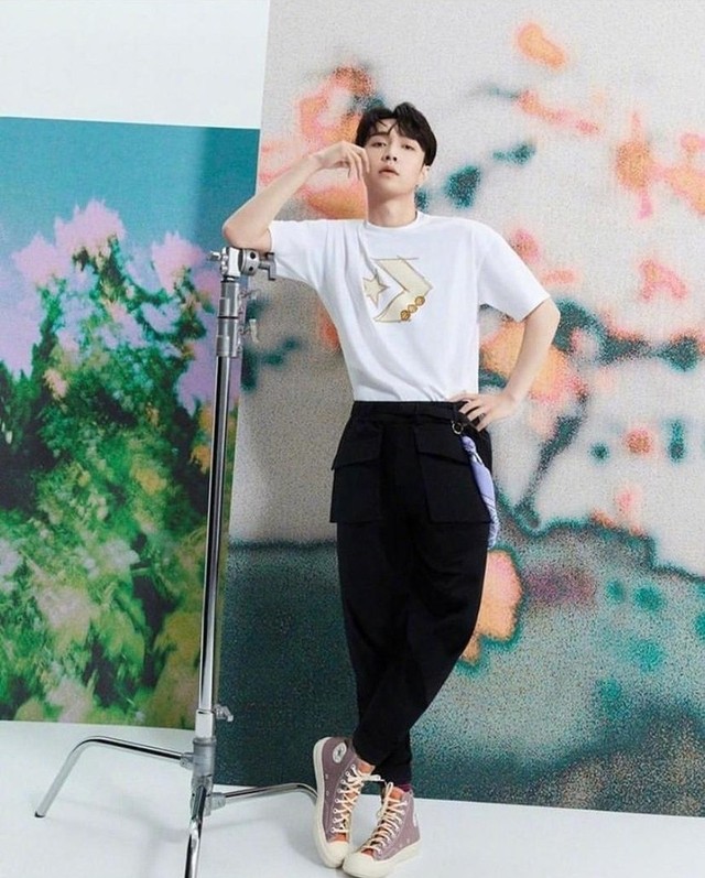 张艺兴慵懒的倚着旁边的架子,简单的一身衣服在这样背景板的衬托下与主题环环相扣,简单却不失风格