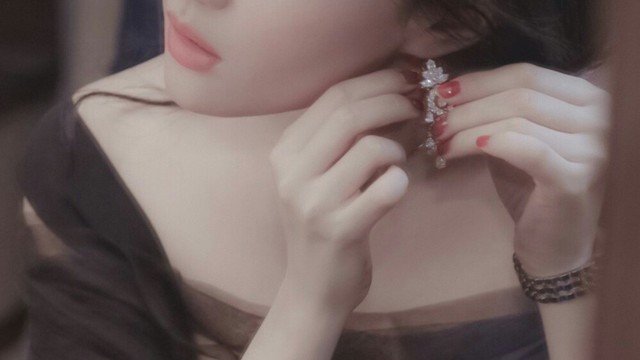 黑色的礼裙衬的肤色白皙,黑色的网纱添了一丝朦胧。