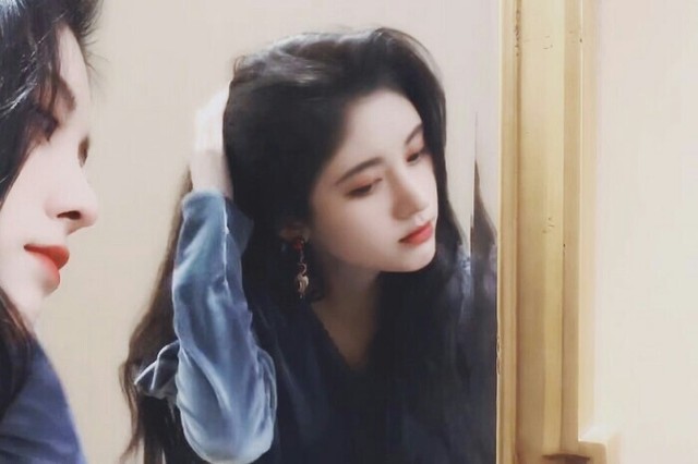 镜中的女孩穿着蓝色丝绒长裙,精致的脸上化着好看的淡妆,既不喧宾夺主,又不黯然无光。反而一颦一笑都显得惊艳无比。好一个人间尤物