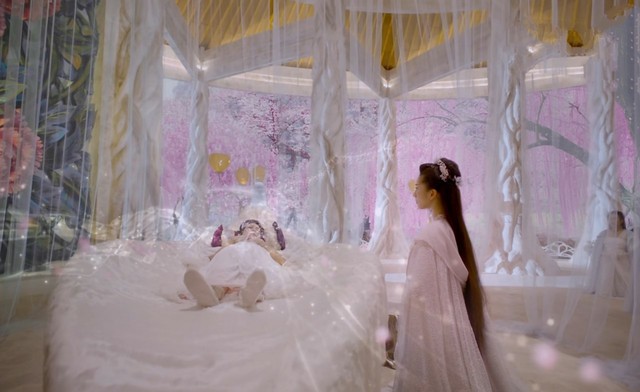 玉兰、杏花、茉莉、桂子、芙蓉、山茶、莲花、蔷薇……纱幔内半空中各色花朵竞相绽放,又快速凋零,花瓣如雨瀑般倾泻而下,落英缤纷,瞬间将琉璃大殿淹没成一片花海,绮丽浩瀚却绝望无依。殿外,花儿们一个个争奇斗艳,相继开放,仿佛在迎接着两个新的生命,欢迎这新的生命的到来,然而这两股生命的到来,给花界增添了不少美丽的色彩。