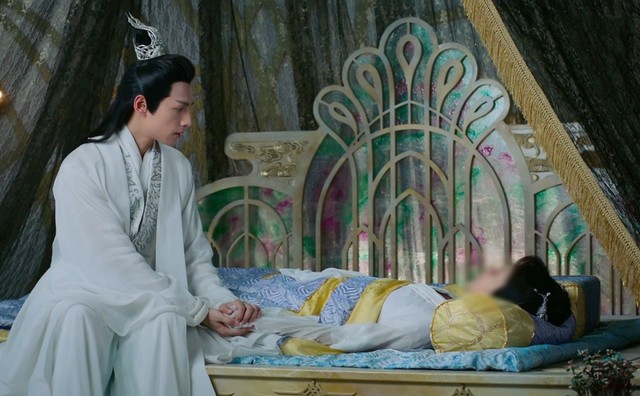 润玉在璇玑宫坐卧不安,他一边思考着夭夭和那名神秘男子的关系,一边担心着夭夭的伤势,他不知不觉中走到栖梧宫门口,敛去一身仙气,悄悄进入夭夭房间,坐在她床前。