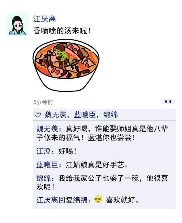 阿羡的师姐江厌离,被成为''全世界最好的师姐'',她对阿羡从来都是完全信任,倾尽心力照顾,把他当亲弟弟看待,在所有人都误会阿羡的时候,依然有师姐给予信任。师姐的莲藕排骨汤,也成了剧中最温暖的东西——