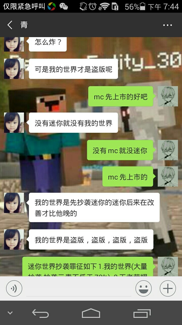 作者迷你玩家勿喷 迷你玩家们,如果你们想要喷此文章,请认真阅读后再说!且务必阅读结尾!①我的世界是一款高自由度的沙盒游戏,1993年开始打造,2009年正式发布。 我的世界封面 迷你世界也是沙盒游戏,只不过它是靠抄袭包括我的世界在内的多款游戏的编码,12月进入了中国人的视线。 3年来,迷你世界(以下简称迷你)给中国游戏发展带来了很大障碍,因为它没有版权,全靠抄袭。2017年7月,瑞典被惹毛了,收回了中国对我的世界的经销权,我的世界下架了。同年8月,网易游戏又花17.5亿人民币再次购回,但我的世界的质量大大下降,而且同时带回的还有外国的嘲笑,说“中国只会抄袭”。 正文分割线 迷你到底做了什么,触怒了MC? 一、严重抄袭。迷你过分抄袭就不用说了,但是迷你的简介上说“迷你世界是一款自主研发的游戏”,真是奇怪。迷你世界95%和MC相同,居然有玩家说是在借鉴MC。如果说,相似度40%以下是借鉴,那么相似度60%~80%是抄袭,相似度在80%~90%就是严重抄袭,继而相似度90%以上是复制粘贴。迷你世界在生物、地形、食物等地方都抄袭了MC,更抄袭了王者荣耀的首页,泰拉的罐子,守望先锋中的弓箭命中标志,史莱姆牧场中的史莱姆,生存战争中的牛,而这些游戏都有版权。有人说竹子、熊猫、蜂巢、电锯什么的迷你有,MC都没有。非常简单:这些都是MC的mod模板。迷你制作者明明知道事实不可掩盖,还把抄袭MC的一些物品更名,比如木剑改成木棍,红石变成电石,还简介说迷你是自主研发的游戏,还在进入游戏时写“拒绝盗版游戏”。本身就是盗版还写什么? 二、恶意攻击谩骂。MC玩家都知道非常多的迷你玩家不断不加以求证就主动谩骂我们,更有甚者还诬陷MC抄袭迷你。最让人无语的是,基本上参与骂人的每一个迷你玩家,说辞都会与另一个迷你玩家矛盾,甚至同一个人发的多篇文章乃至一篇文章都会有许多自相矛盾、不符事实的地方。这一点我们在第三点会详细说明。 看到这里,也许很多迷你玩家会说:“为什么我们在论坛里看到的,都是MC玩家先骂的我们迷你玩家?”对此,我认为主要是因为迷你玩家比MC玩家少很多。我们可以到网上去看,截至2019年8月2日15:40,迷你的下载量为1.8亿,而MC中国版有7258万人,国际版林林总总有2.4亿人(国际版为不完全统计)。所以说,迷你玩家与MC玩家数量比约为18:29,比MC少了将近⅔。那么,根据这个比例,骂迷你的MC玩家当然会更多。当然,也不乏某些MC玩家素质低下,而某些素质相当低下的迷你玩家就凭借着这一点来斥责MC玩家是不对的。 三、散播谣言。有些迷你玩家除了极其没素质以外,乱编造文章、理由的本领不得不让人佩服。最出名的就是说迷你世界在2003年就打造出来了,但因为没有足够的钱,而且制作人不久后就逝世了,迷你世界就没能发布在各大应用商店。而2009年的时候,一个美国人见着机会,抢先复制了迷你的编码,并更了名,发布了出去。到了2015年,作者的儿子才将其再度发布了出来,其实是MC抄袭迷你世界。而这个“故事”可以说是漏洞百出。 漏洞1:在2003年,中国正处于经济复兴阶段,还没有足够的能力来制作沙盒类游戏,就算有人做出来了,那么将会轰动全国,甚至世界,而应用公司是抢着购买你的游戏,根本不需要你掏钱。 漏洞2:假定漏洞1不成立,那么在制作游戏时都有资金预估,就算有误差也不会超过很多,不可能做好了才发现没钱发布。 漏洞3:为什么2003年游戏就做出来了,资金要筹集到2015年才再发布?时间太长了。 漏洞4:如果MC抄的迷你,为什么MC在2009年发布之后还会推广到全世界,而且会有那么多版本? 漏洞5:如果MC一直在抄袭迷你,那么迷你公司完全可以把MC起诉。 漏洞6:MC是在2009年发布,那迷你玩家你们难道不知道MC是在1993年就开始制作了的吗? 漏洞7:既然迷你还没发布,为什么别人还能复制编码? [图片] 漏洞8:迷你世界创始人古振兴,他和他的父亲至今依然健在。 漏洞9:网上还有其他说“MC抄袭”的文章,许多和这篇文章完全不符。 漏洞10:制作者Notch是瑞典人,瑞典人! Notch多少次更新MC、修改细节、添加部件你们这些低素质迷你玩家都知道吗?你们不加以求证,就随便诬陷、谩骂MC,你们想想自己行为,难道不觉得很可耻吗? 迷你世界封面 四、以爱国的借口打幌子。有许多迷你玩家说玩迷你爱国,MC是外国打造的,玩MC的卖国,要尊重国产游戏。那么,如果你很爱国,就把外国人发明的手机、电脑、电视什么的都砸了呗!你不是爱国吗?英语别学,方程也别列,阿拉伯数字也别写啊!再说,网上还有很多国外原创的游戏(如英雄联盟、守望先锋等),为什么你们也玩啊?爱国仅仅是你们这些玩家的借口! 就在前一段时间,我在百度贴吧里看到有位迷你玩家不断谩骂MC,言辞不堪入眼。那位玩家还说我们MC玩家一看到好的游戏就嫉妒,就凭空捏造迷你抄袭的事情,以这个理由来骂迷你。还有一位令人恶心的迷你玩家,他觉得在其他平台骂MC会被反驳,于是就发经验骂MC,可更令人无语的是,这两篇文章,均为抄袭。(想了解详细的朋友可以点击此链接)对于这两位玩家,我也是不想说什么了,你们也不上网看看迷你抄袭证据有多少? 上述用户发布的经验 [图片] 最搞笑的是,当我给附近的几个不断谩骂MC的小学生迷你玩家看了广州知识产权法院审判迷你的裁决书时,他马上改口,讨好MC,还声称“我再也不玩迷你了”。自己没有本事就别怪别人,谁让你们迷你