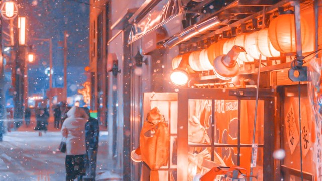 炎热的夏季,暖黄色灯光下,群演们穿着反季节衣服,人工降雪,聚光灯,摄影师都已就位,全方位模拟场景。