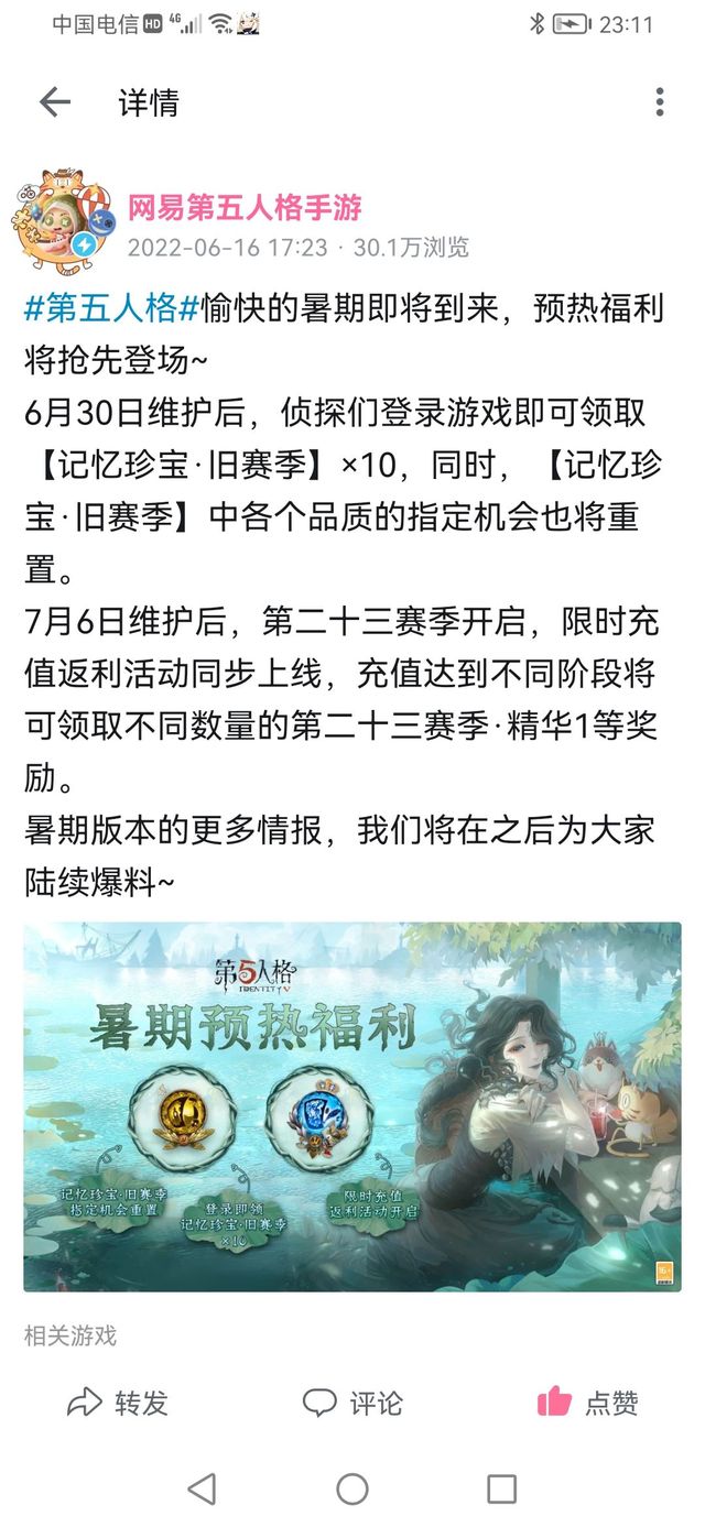 7月6日维护后,第23赛季开启,限时充值返利活动也同步上线,充值达到不同阶段将可领取不同数量的第23赛季精华1等奖励