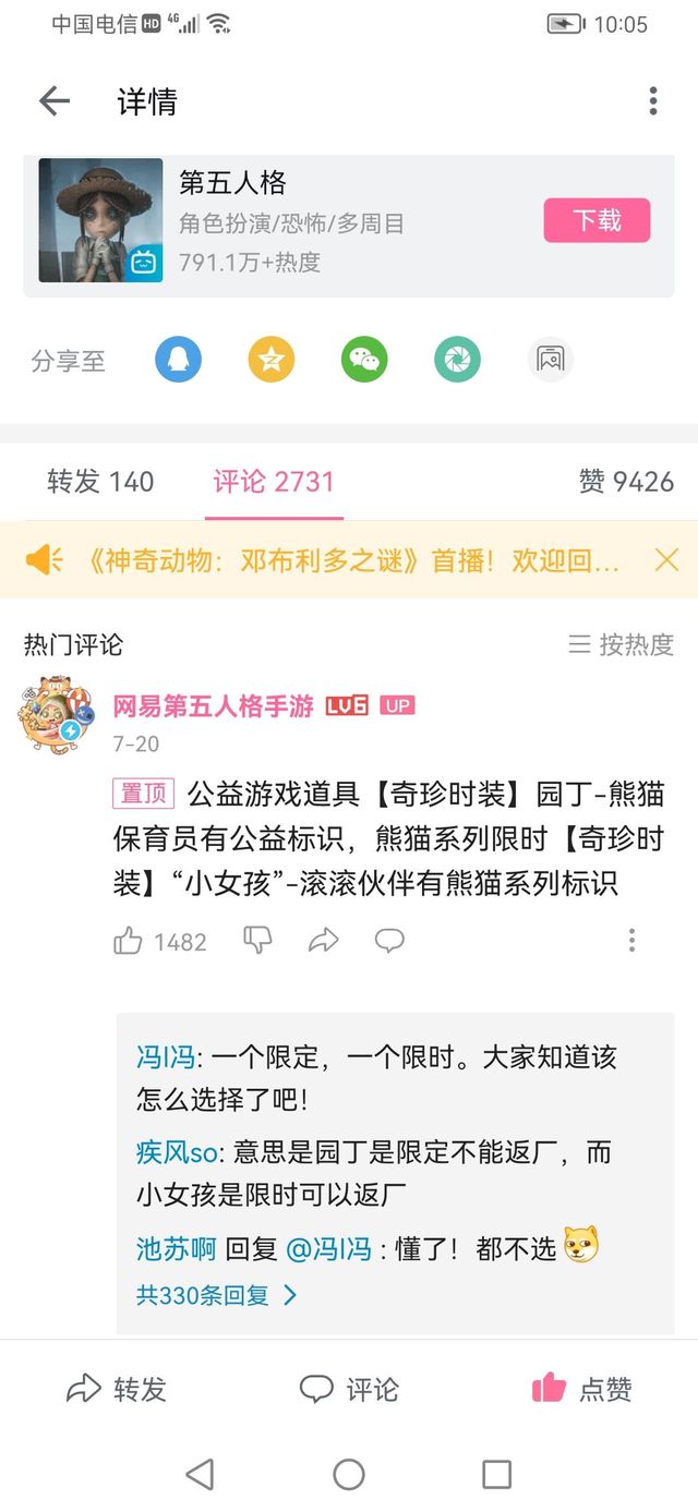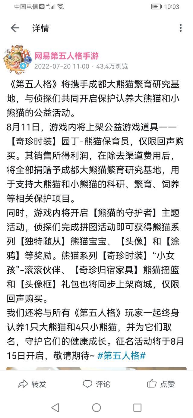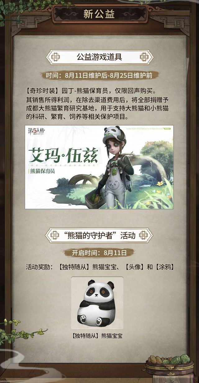 我们还将与所有《第五人格》玩家一起终身认养一只大熊猫和四只小熊猫,并为它们取名,守护他们的健康成长。征名活动将在8月15日开启,敬请期待~