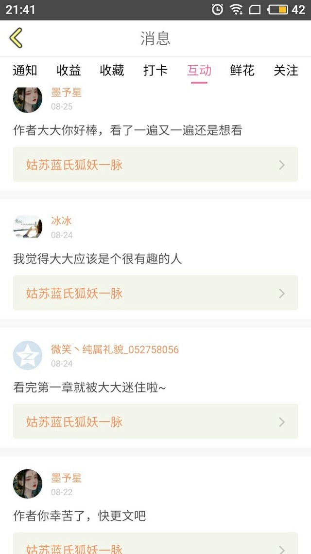 作者我每次点开话本小说翻了我自己的主页。看到的每个人在收藏,互动,关注,送礼里面每多一个人我都觉得好感动。