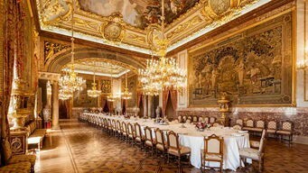 白色桌布覆盖在长长的餐桌上,桌面上摆滿了琳琅满目的菜品,菜品的尽头,一位气势逼人的男人