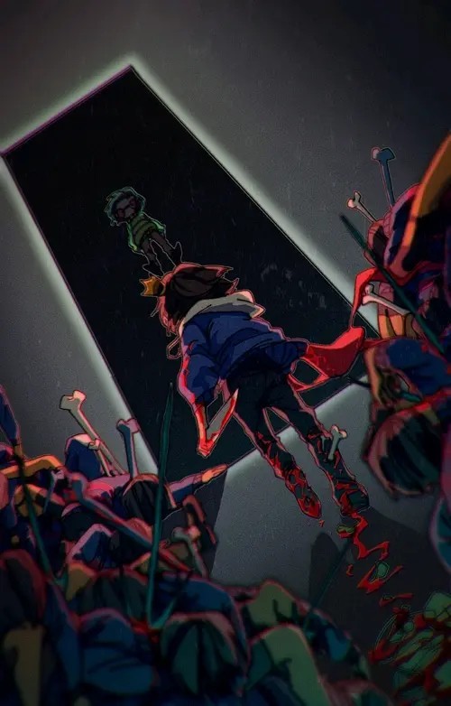 Asriel吸收了chara的灵魂,变得十分的高大。隐隐约约还能看到他之前的样子。