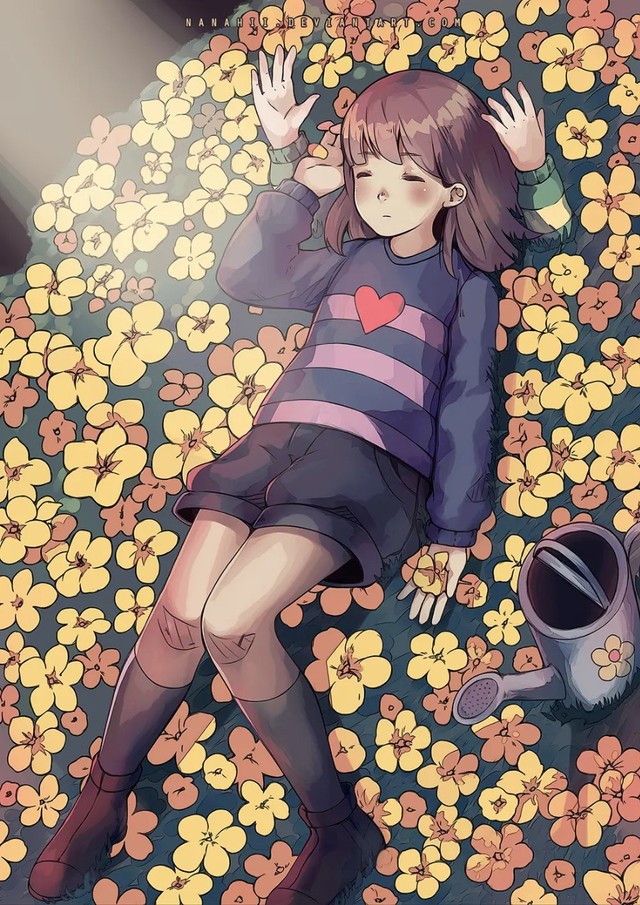 他身上插着许多人类的武器,他抱着chara尸体就那么倒在了花丛中,还带来了地面上的一些花的种子。