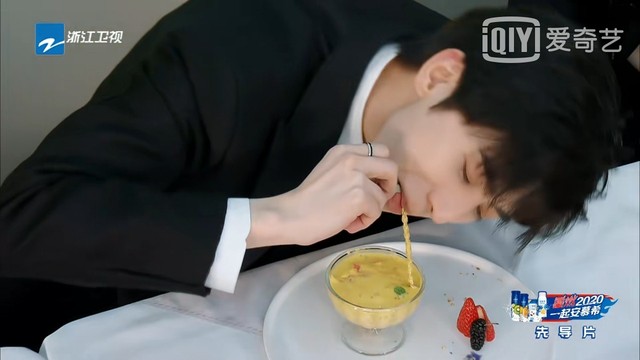 节目组给大家上了一些搞笑的餐具,比如李晨就是要用两面都是凸的凸凸勺吃果冻,郭麒麟用上下会动的弹簧勺吃芋圆烧仙草,沙溢用鱼露一体勺杨枝甘露,baby用弯筷子吃椰子冻,郑恺拿匹诺曹手办吃糖豆
