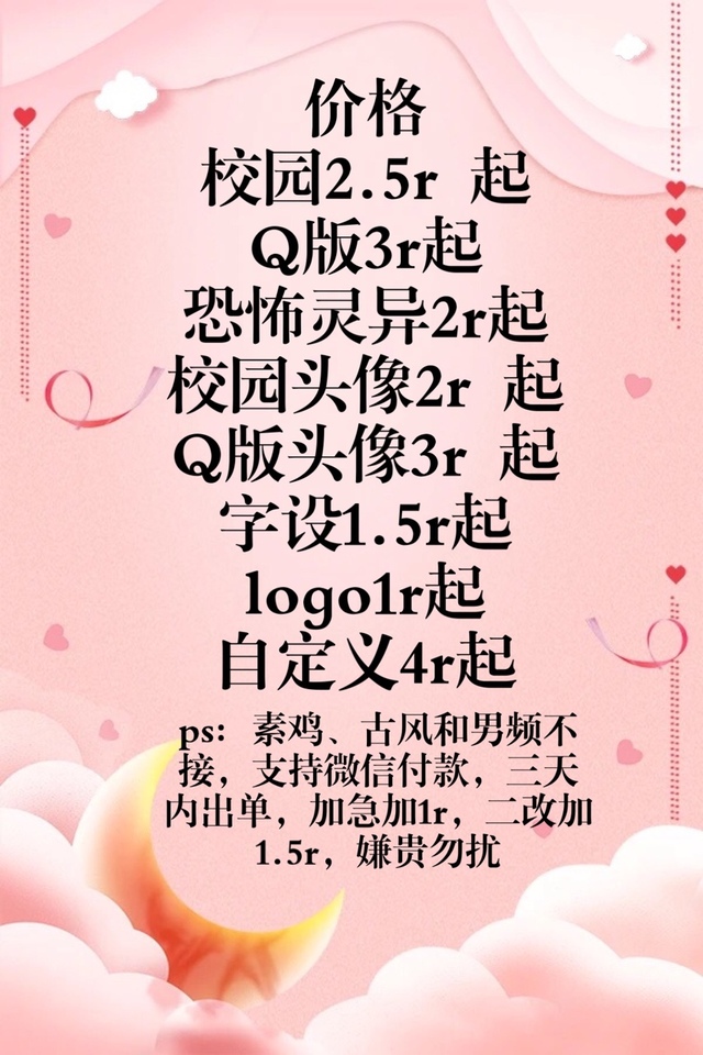 程錦衾♡书名:♡作者:♡作品类型:♡现代/古代/架空:♡男频/女频:♡简介:♡要求主色:♡作品软件:♡免费普通/付费精封/付费素锦:封面风格:书名字体风格:小字(素锦必填):是否加急:其他:注意事项:◎可以反复下单◎加急/二改另收0.5r◎可以不给底图,若有底图请在“要求主色”上写上“我有底图”◎想取关先私信,取关后就不要再来找我做封面/头像了