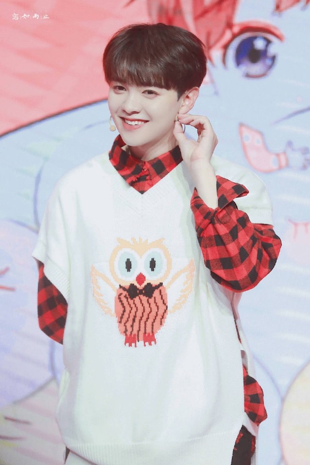 尤长靖穿了一件红色格子衫,外配一件白色毛衣,毛衣上还有一只可爱的猫头鹰。