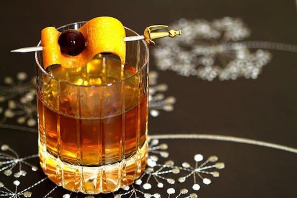 艾酒起身给祁棠调了一杯酒,酒的颜色特别漂亮盛装在古典杯中的古典酒。