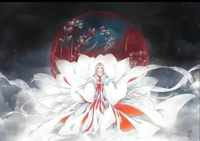 她坐在一个巨大的莲花当中,一脸妩媚的笑容望着兮兮