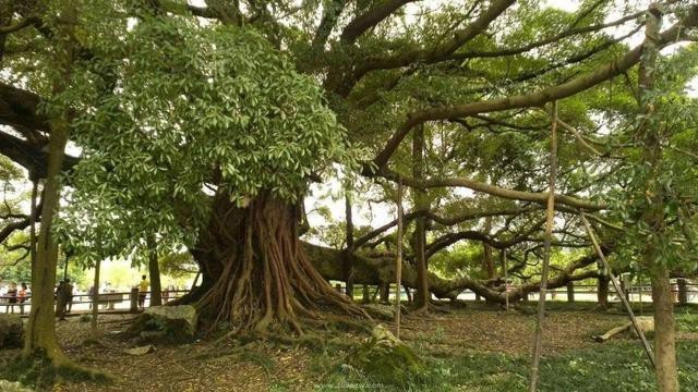 这棵百年的大榕树,根如蟠龙,皮若裂岩,像个百岁老人,捋着长须。