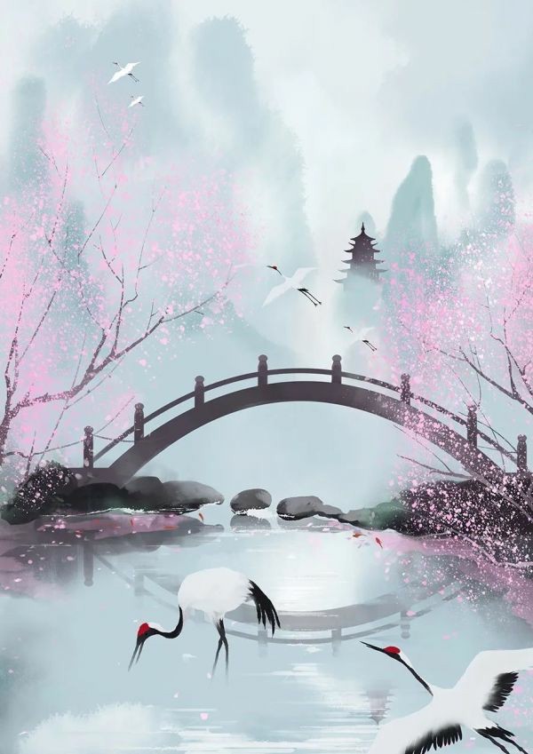 清激见底的水面上,偶尔有几只鹤鸟飞过,惊起阵阵涟漪。河边栽种的两棵桃树,还是当年怜音作为生日礼物送给的昭若,小桥水鹤,落花流水,好不惬意