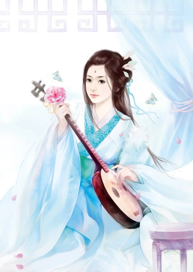 牡丹斜倚卧榻,手执一把月琴,眼底透着思念。玉手轻挑琴弦,发出泠泠清响。微风拂过,飞花散落,蝴蝶蹁跹,手上牡丹愈显妖艳。血红的抹额,如一颗朱砂痣,熠熠生辉。