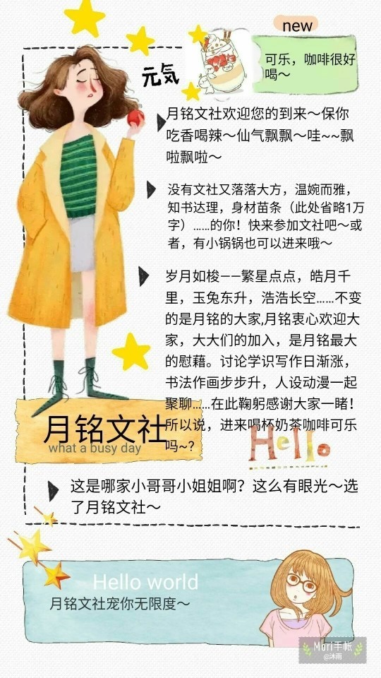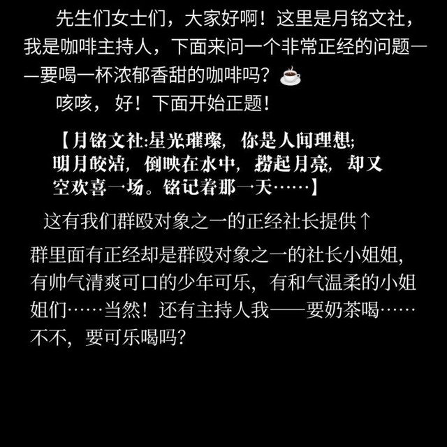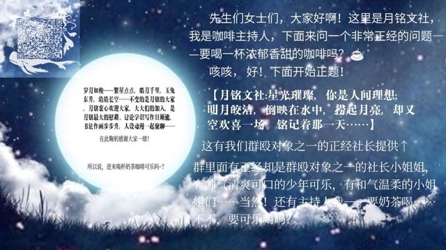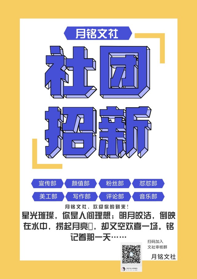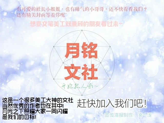作者君:小玖对啦!没有文社的宝宝们,可以考虑一下参加这个文社:【星光璀璨,你是人间理想。月光皎洁,倒映在水中,捞起月亮🌙却是空欢喜一场。铭记着那一天……】——月铭文社