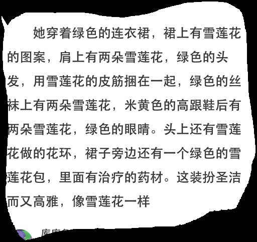 安安的变身服:绿色的长发披散开来,两小缕头发编织成麻花状,有那两缕麻花辫完全形成丸子状,头上由彩色雪莲花编织的花环。绿色的连衣裙,带着白色的丝带,白色的丝带上有绿色的雪莲花图案,裙子的腰围有少量的雪莲花,腰围的上方有一个白色雪莲花图案,裙尾有一圈白色的雪莲花,裙子中间部分为白色点状小彩石。绿色的丝袜上有朵雪莲花。米黄色的高跟鞋后,有多彩色的雪莲花,前面有白色雪莲花的logo。圣洁而又高雅,不矢一点雪莲花般的精神。