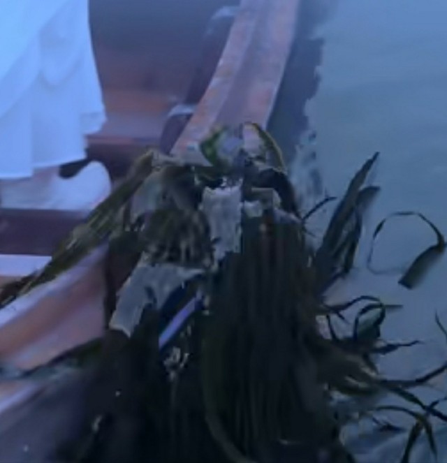叶春草看着船底下滑下去的那堆‘海带’。