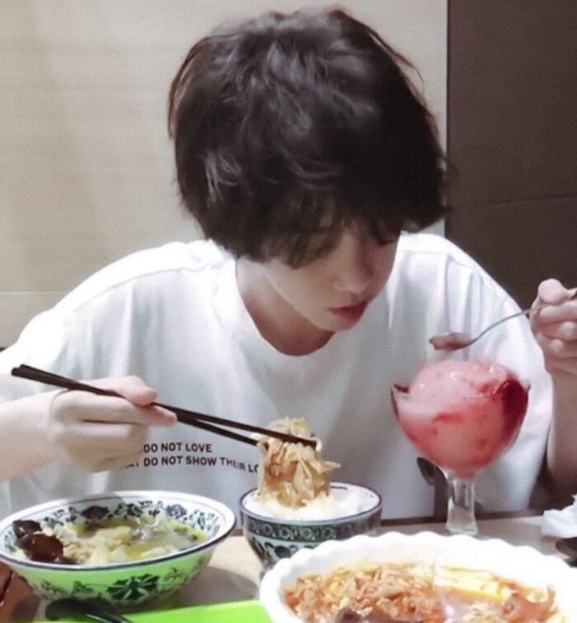华晨宇低着头吃着饭,偶然说一两句话.