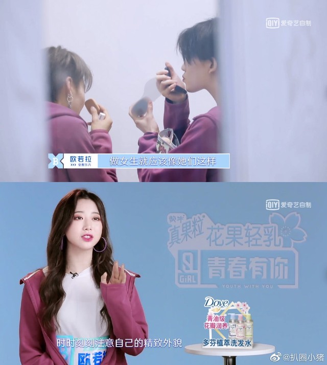 陆柯燃和刘雨昕在那补妆,鹤粥粥则懵懵的看着这俩“化妆大佬”。