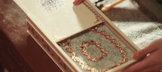 裴柔嘉拿出一只紫檀雕花匣。匣面錾刻着缠枝牡丹纹,四角包着错金云头。
