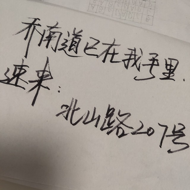 (乔南道已在我手里。速来:北山路207号。)