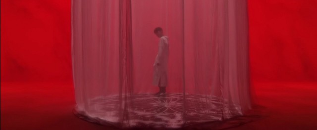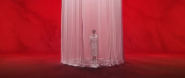 只见在空荡荡的纯白房间里放着一个类似于圆形的舞台,从上垂下来的薄纱帘隐隐约约能看见一个人站在里面。