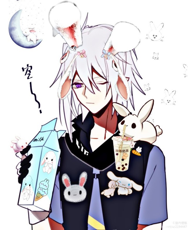 头上两个兔子头饰,牛奶瓶印着兔子标志,衣服上绣着兔子图案,手上和肩膀上爬着一大一小的兔子,背景满满的都是可爱的兔子……