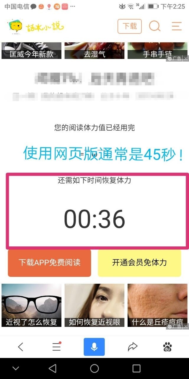 话本小说的体力值,每本书都会以十秒钟30秒钟一分钟一分半钟两分这样递进。而一个广告通常时间为30秒,手机APP广告内容通常是清北网校.学而思网校.高途课堂,这样的教育平台。所以说在一分钟的时候,进去看广告就可以节省半分钟,一分半钟的时候看广告,节省一分钟,依此类推