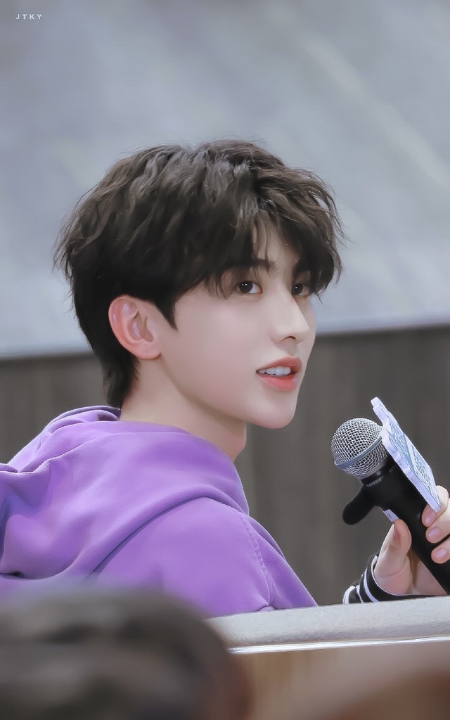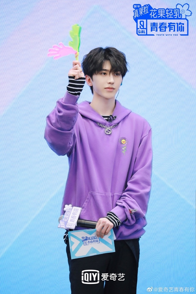 蔡徐坤今天身穿紫色上衣,手里拿着儿童玩具,不得不说,有些可爱