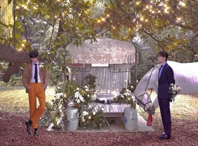 肖战身着一生暗橙色的西服,王一博身着一身黑色的西服。
