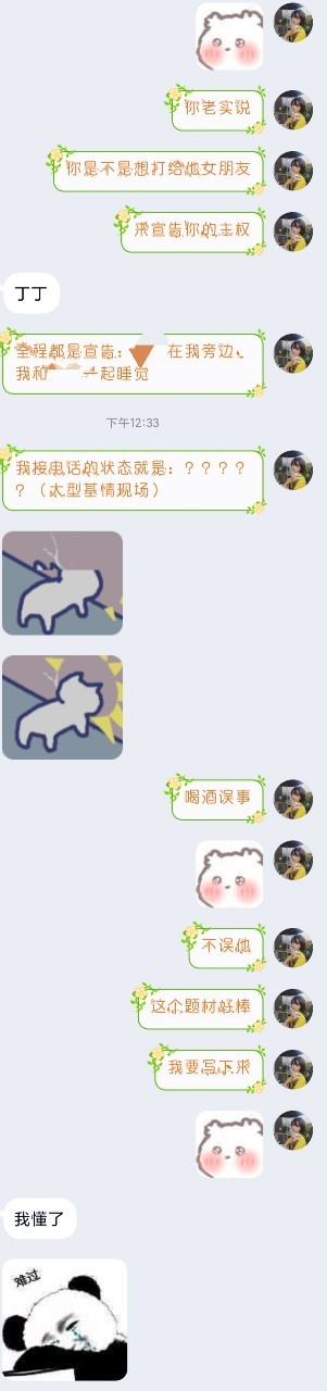 我真是个内心坚定,充满理智的孩子,被夸了也不没有漏掉他可疑的中风语调和突然夸我。以前他也有喝多了的时候,不过那时是给我或者舍友发乱码(我们经常借他上学期的课设看一看),没有过打电话,或者打字喊我出来请喝奶茶,那时候我在赶代码,错失白嫖机会(痛惜扼腕)。他今天给我打电话,明天肯定会后悔哈哈哈哈。
