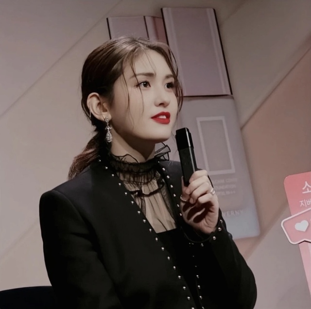 女孩一手拿着麦克风低着头,滑嫩的皮肤在鲜红的唇色下显得更加白皙,那双眼眸里的笑意却在此刻不达眼底.
