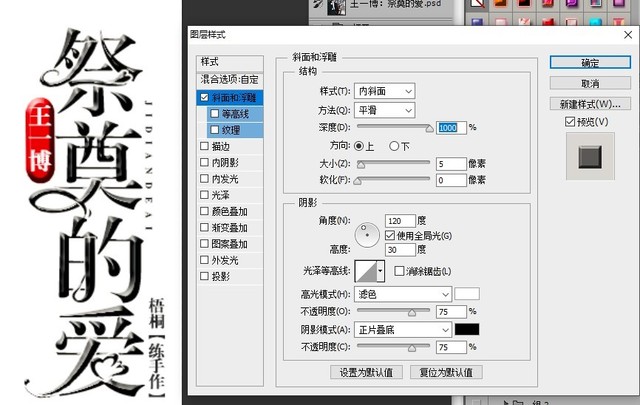 美工-梧桐首先,对斜面和浮雕进行设置,可以仔细看一下我的数值和效果图: