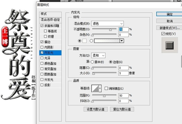 前面打了勾说明设置了这个效果,样式——内斜面,方法——平滑,深度——最大,其他的我是默认的。