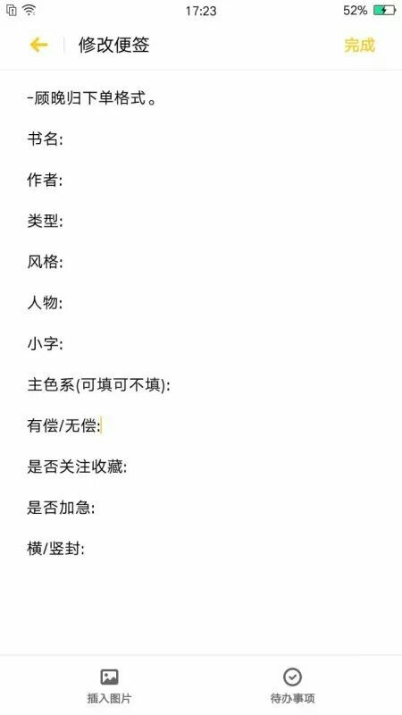 顾晚归“一律周末出单。三星期内莫催我,等不起删评取关随意,一人无偿最多两单,有偿竖2r,横1r加急加0.5r。”