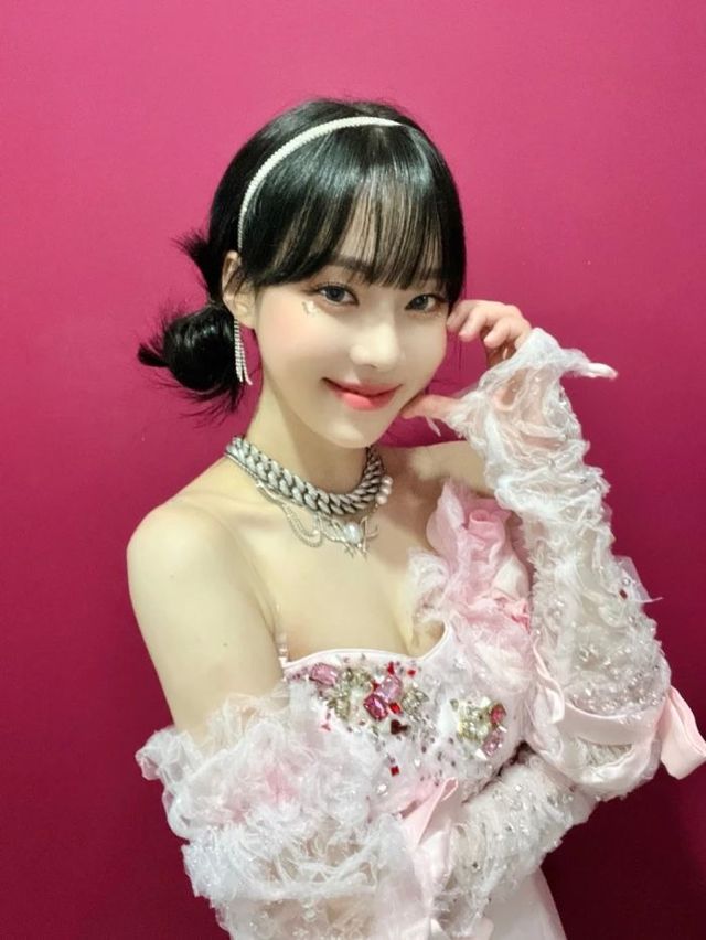 时尚品味本来就很好的金冬天换上了抹胸短裙和羽毛蕾丝袖,带了发箍和项链作为点缀,华丽且特别。