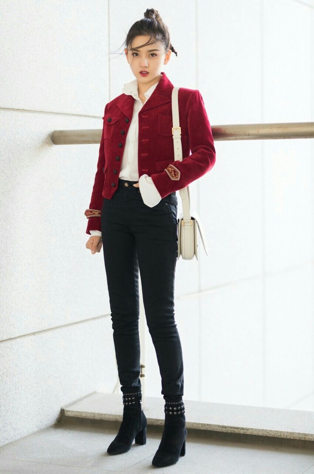 一位上身红色外套里面白色衬衣下身黑色紧身长裤,脚上黑色短靴
