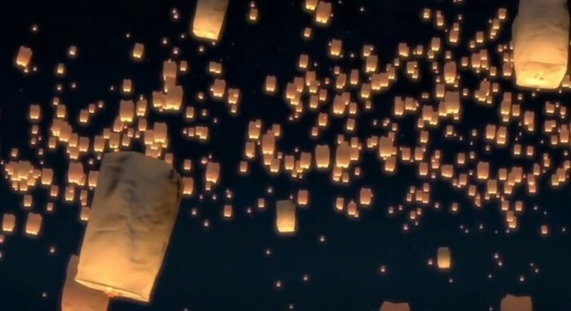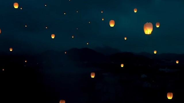 子虚和魏北清立于一盏孔明灯上,每一盏孔明灯就尽在眼前,从面前缓慢的飘过,都可以看见孔明灯上的祝福语和每个人的愿望 千盏孔明灯,也不过如此。