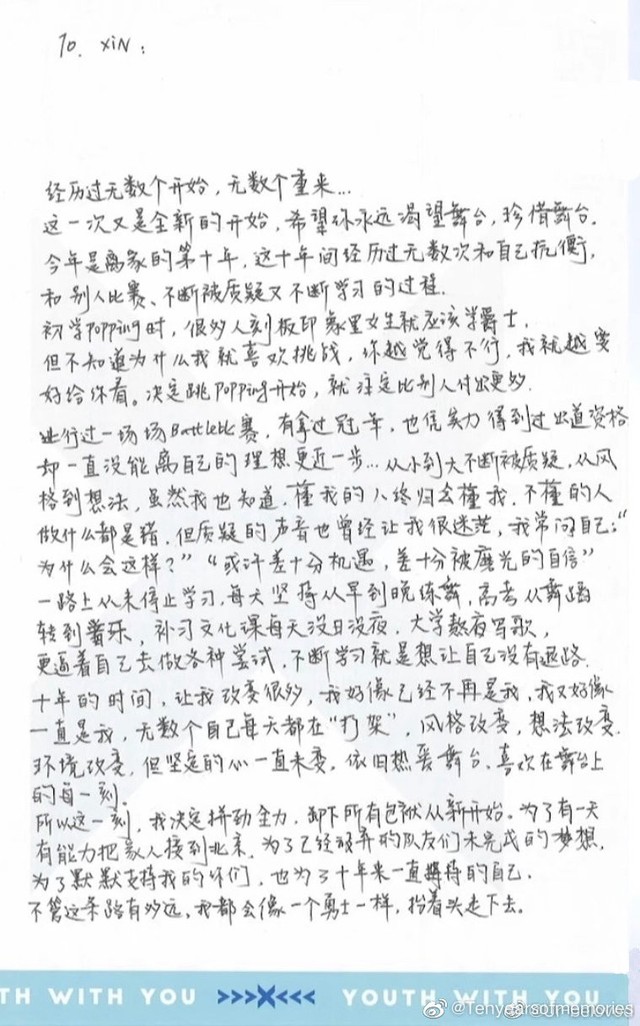 小编我不是一个老粉,我确定粉上昕昕子也只有不到三个月,以前只是关注她了,但不是她的粉丝。 我相信有很多人和我一样从喜欢到op再到死忠的时间很短 这是我第一次正式追星,激动又兴奋,很想真的做点什么。 我很庆幸,第一个认真追逐的人竟然这样好,她找不到黑料,实力断层,谦逊而懂礼,善良又真诚。 这几天我有些焦虑,因为我四处看了很多的评价和言论。 “刘雨昕实力强但是应该不会让她当C不会让一个中性风当C的” 这样保持“客观”的预测我看到太多了。 我确实担心了, 我担心会有人不接受她的短发, 我担心节目组会因为她的风格限制的她的C位。 但我看到她的采访, 她的坦诚让我知道这并没有困扰到她。 或许曾经困扰过,但那已经过去。 我看到的她,会坚持在正式录制的时候把裙子换成裤子,会面对镜头说“我认为这是上个世纪讨论的事了”。 我一直在想,到底什么是真正的不被定义。 一个女孩,努力十年,坚持十年,在全是男孩的舞种里成为了佼佼者。 她只是剪去了长发,换下了裙子, 是我将包容想的太好了吗,这绝不可能成为阻碍她的理由 大家口口声声说不定义女团,女孩要做自己最喜欢的样子,不要为了迎合男性而改变自己 可大家又信誓旦旦的说“她不符合C的标准”“她站C会影响整个团的风格”。 我理解大家的质疑, 但我绝不接受这样虚假的“不定义”。 人人认为自己可以独立,但在环境里坚持自己,何其困难 第一次排名她第八。 她平静的上台感谢我看得到她眼里的光,这是她看见的机会, 但我们都明白,这并不足够, 她的实力可以拿C,她的人品可以拿C,她的努力可以拿C,她的坚持可以拿C。 而我们需要做的,只是让她知道让所有人知道,她的雨伞她的粉丝爱着她的所有人也足够她拿C。 我看到了很多以前的故事,商演,练习,梦醒了....还有现在的一个月跑四趟医院。 我看过很多的热血与激情,但我为独属于她的勇敢和从容而骄傲。 不骄不躁,平和温柔。 我极少看见这样的人, 情绪不会大喜大悲,表情没有大起大落, 她永远温和的微笑,不理会不辩解不怀疑不骄傲也从未向镜头展示脆弱。 这才是我们雨伞最大的底气, 刘雨昕是一个这样温柔而强大的人。 这个世界很有趣, 有的人忙着做梦,有的人忙着做事,有的人忙着做戏。 还有一些人不慌不忙, 即做事又做梦, 又在人生这场戏里做自己。 第三次投票开始了, 这不是一个简单的投票,所以我要拼尽全力。