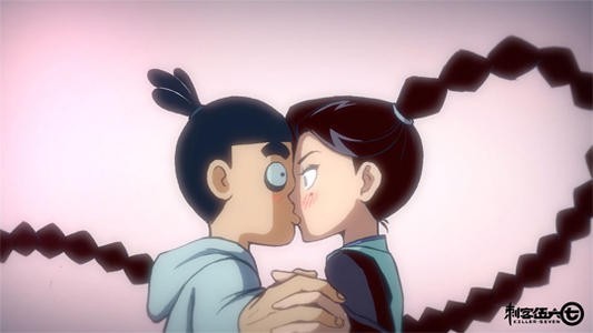 伍六七把滑板踢到梅花十三让她被绊倒,然后在她摔到地上的一瞬间把她搂起来按在了墙上