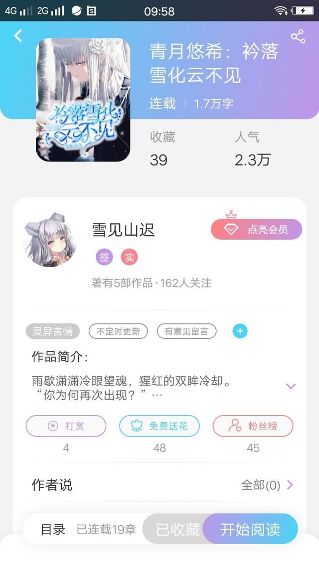 落雪(繁花)不仅如此,此书的两个主角也与我有着千丝万缕的关系,或者说,现实中的我和她就是书中人物的真身。所以当我看完此书时,瞬间泪崩心塞(´-ωก`)。