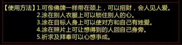 功效:涂抹嘴唇,让口才变好,涂抹额头会让周围人对你有好感,无论男女,都想和你交朋友,涂抹在爱人心口处,对方会无时无刻不想你,涂抹乳头,艳遇爆表,