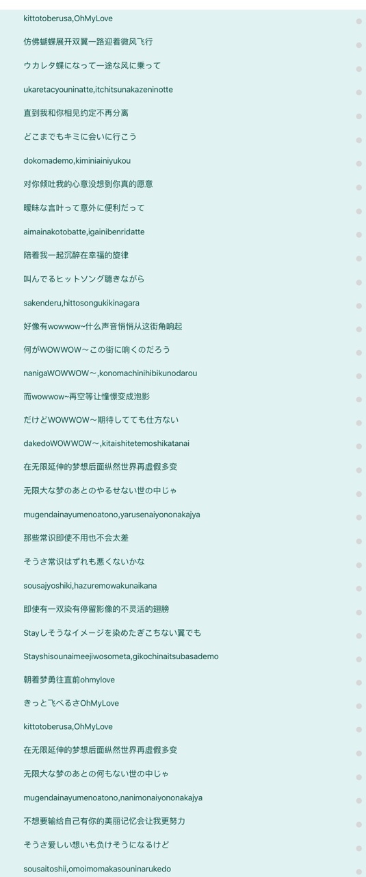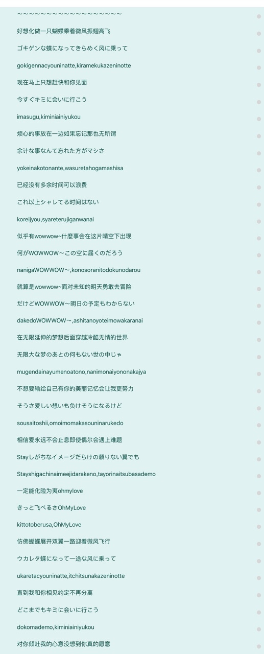 陆心岚ゴキゲンな蝶になってきらめく風に乗って、今すぐ君に会いに行こう,余計なことなんて忘れたほうがマシさ。これ以上洒落てる時間はない。何がWOWWOW〜この空に届くのだろう。だけとWOWWOW〜明日の予定もわからない。無限大な夢の後の何もない世の中じゃそうさ愛しい思いも負けそうになるけど、Stayしがちイメージだらけの頼りない翼でもきっと飛べるさオンマイラブ