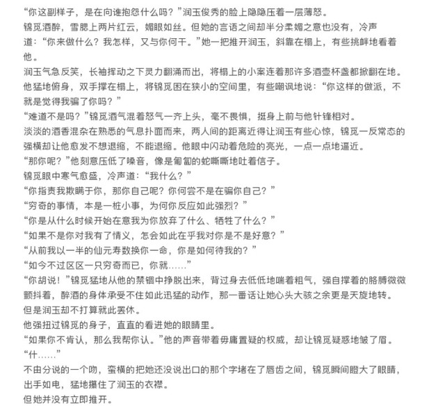 其实早在她窣窣起身之时润玉便已经醒了。他晓得锦觅心神不定,便依旧装睡看她要做些什么,见她要走时刚想问她要去哪里,就被落在眼睛上的吻牢牢拴在床上。她是以什么样的心情留下这个吻的?她又是以什么样的心情离开的?等她回来之时又会是如何呢?润玉不得而知,不过有一点他心里雪亮,锦觅一定会回来。