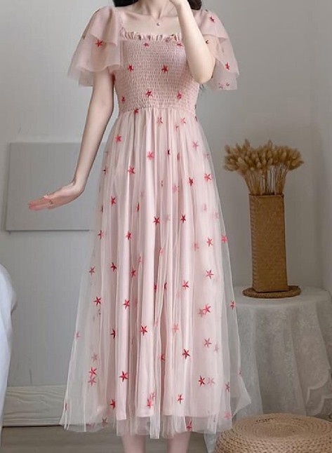 裙子是淡粉色的,蓬蓬袖,薄纱上点缀着小星星